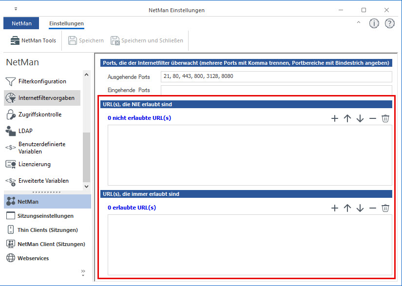In den NetMan Einstellungen, auf der Seite Internetfiltervorgaben, haben Sie die Möglichkeit, bestimmte Internetseiten explizit zu erlauben oder zu verbieten. In der Liste URL(s), die nie erlaubt sind definieren Sie zusätzlich zu den über die Altersgruppen definierten Filtern, konkrete Internetadressen, die verboten sind.